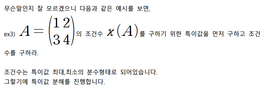 조건수가 1에 근접하면 오차에 민감한 변화가 작고 조건수가 크면 작은 오차에 민감한 변화가 큰데
